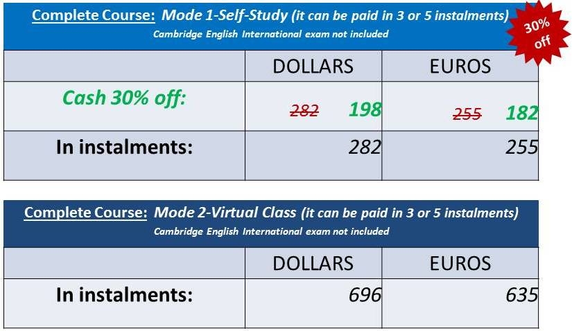 In both modalities, you will have access to our Virtual Campus where you will do some practice online and check the assignments after each class. Study notes for each lesson are available there.